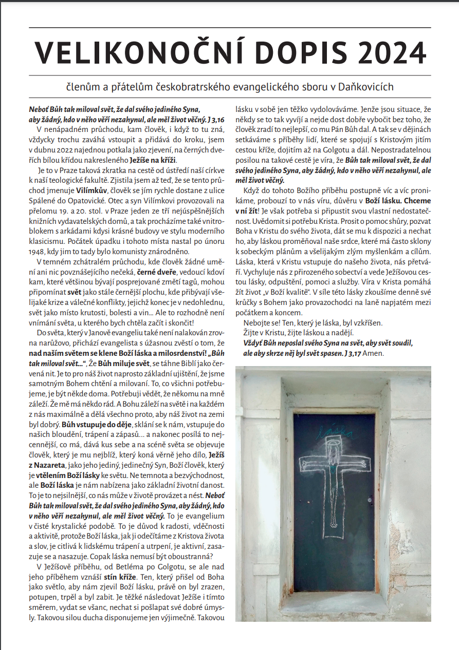 Milí členové a přátelé Farního sboru ČCE Daňkovice.