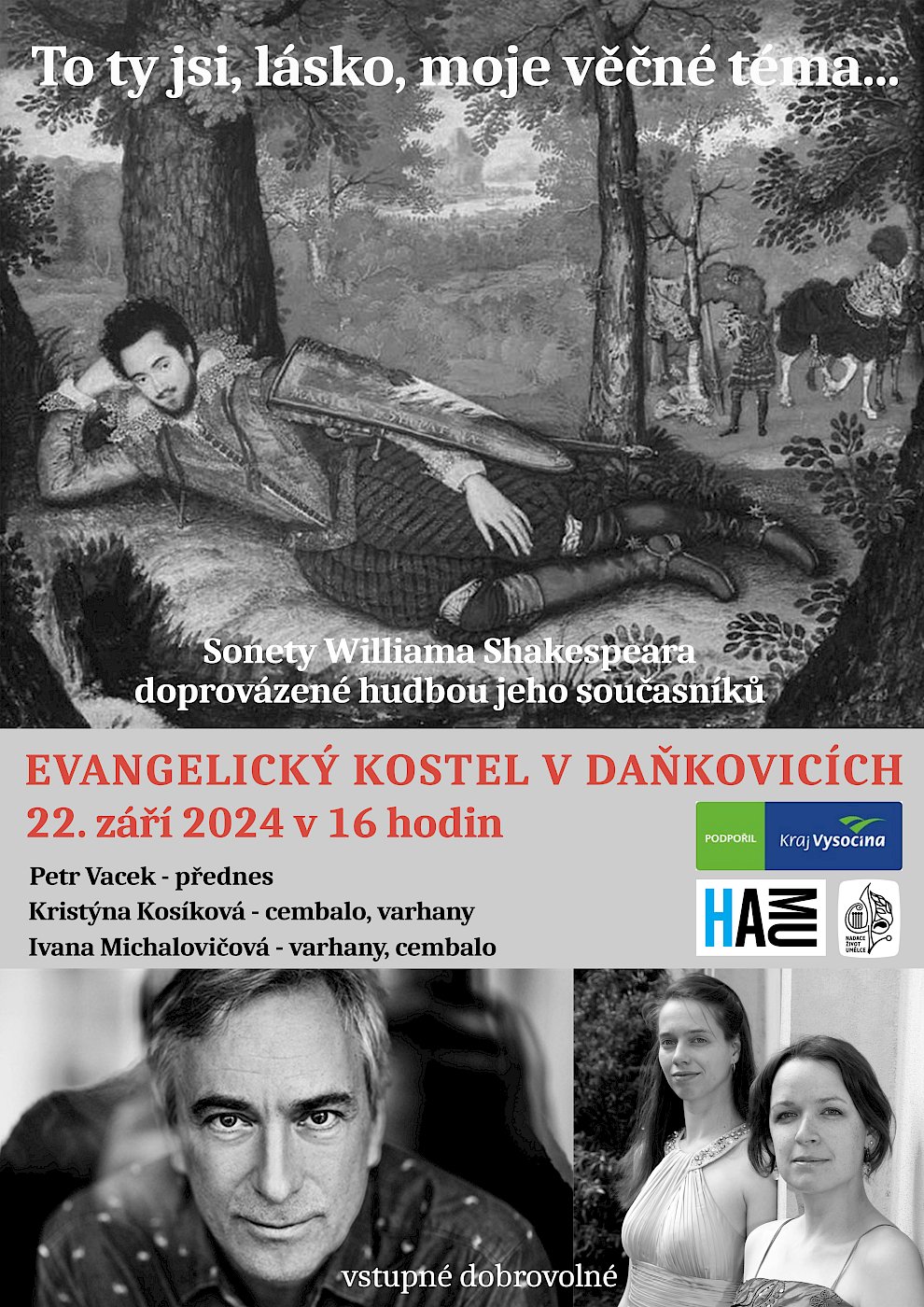 Zveme Vás na jedinečnou možnost poslechnout si sonety W. Shakespeara doprovázené hudbou jeho současníků.
